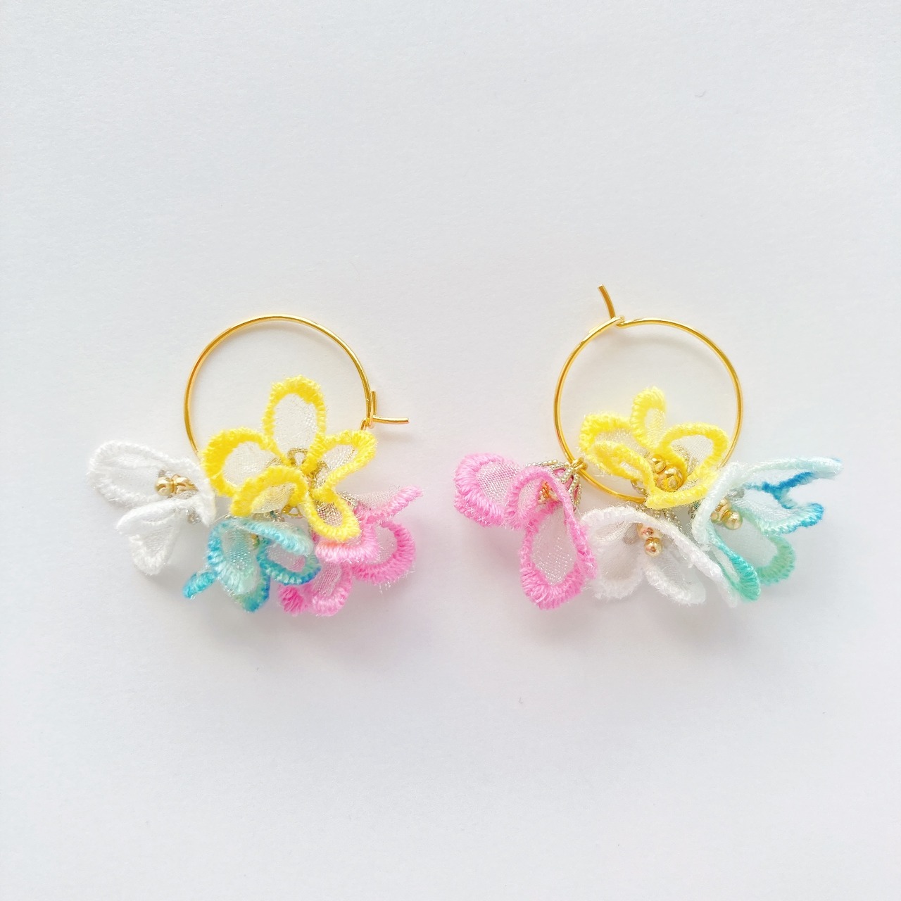 国産の刺繍レースを手染めして、刺繍したものをカットして作っています。