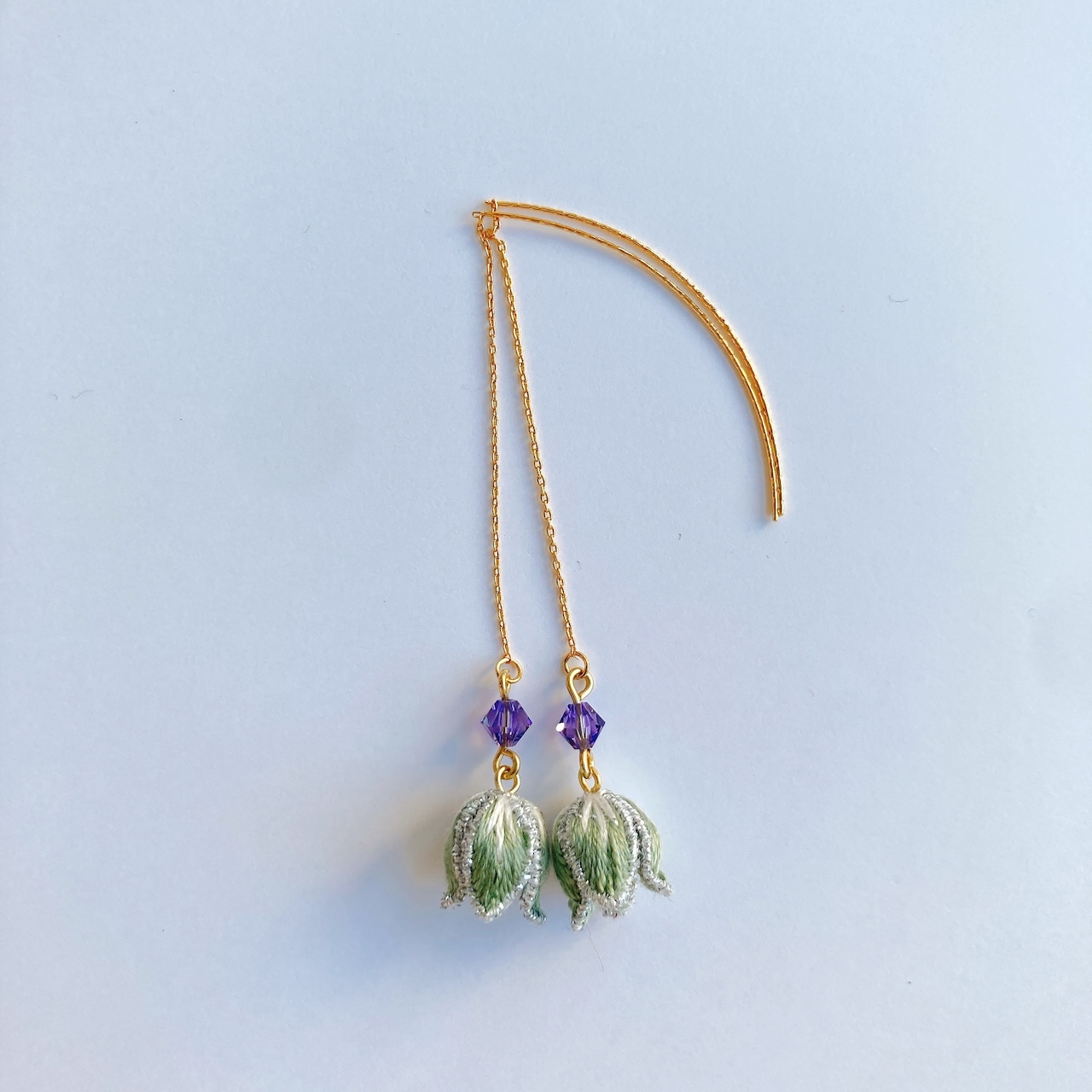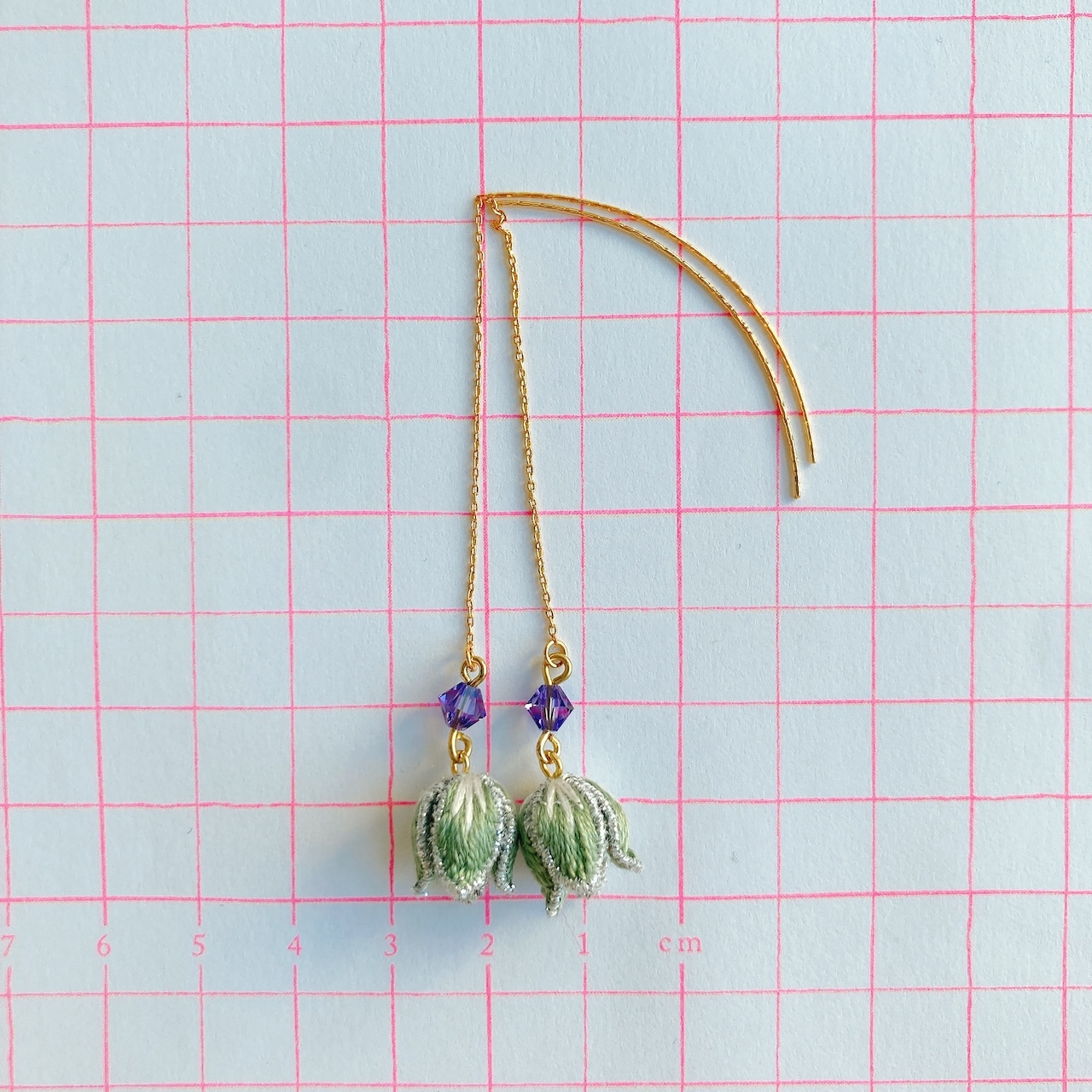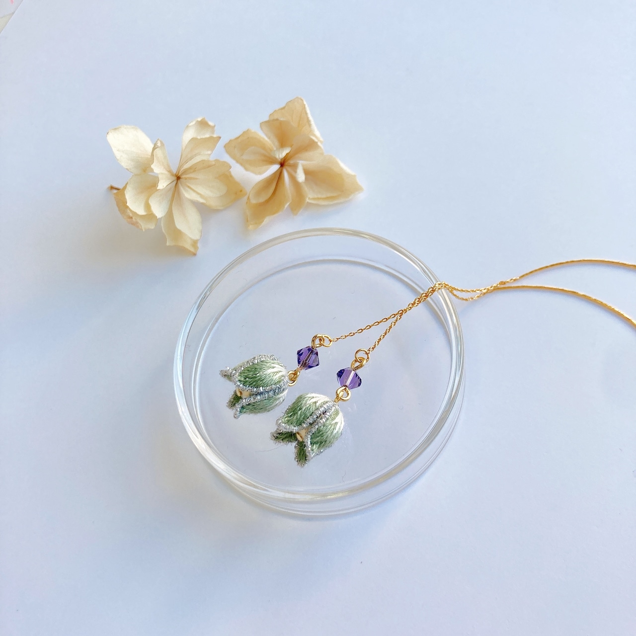 輪郭にワイヤーを縫いこんで立体的に成形できるスタンプワークという技法を使った、ひと粒すずらんの立体刺繍ピアス/イアリングです。
