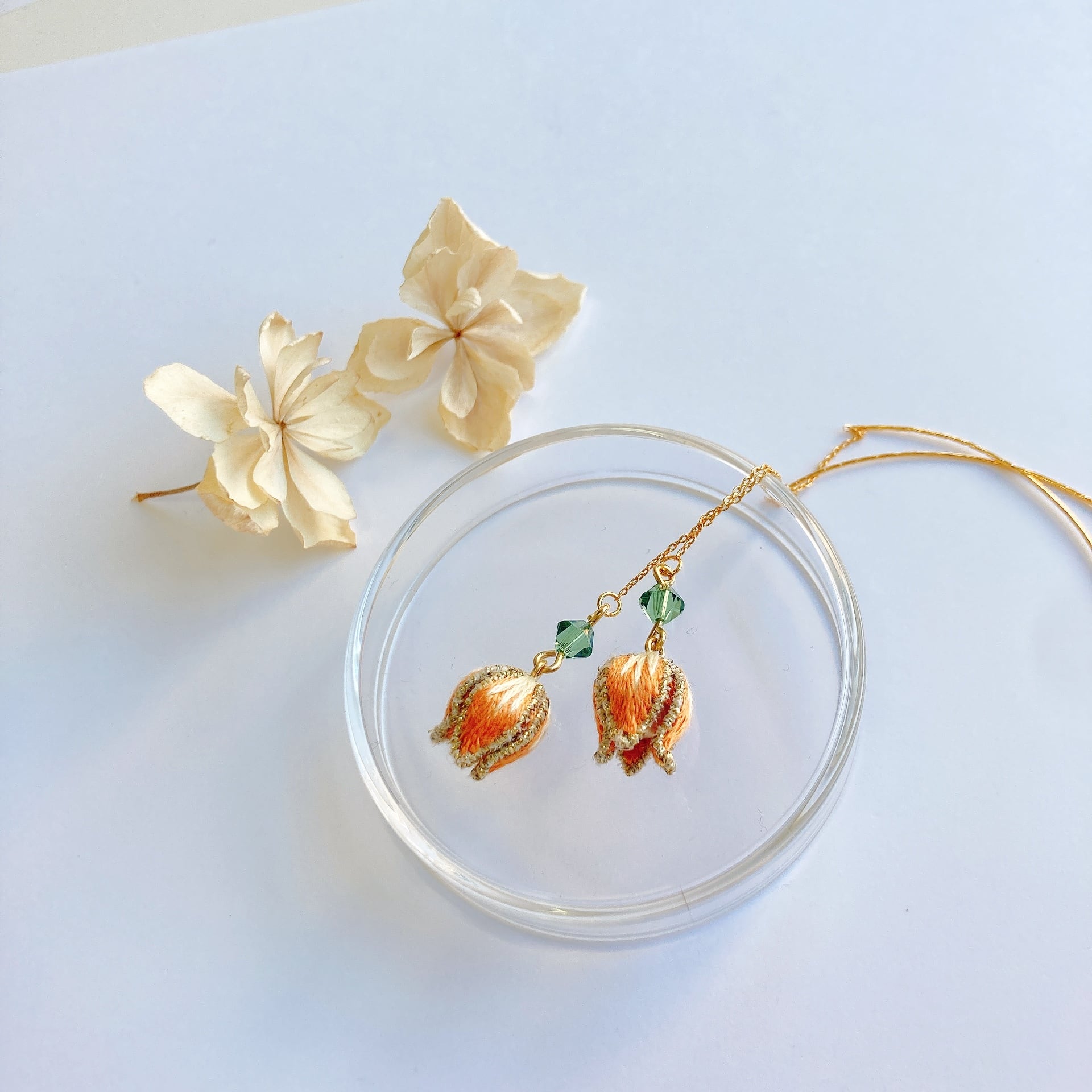 糸を使用したアクセサリーです。ご使用状況や経年で糸の毛羽立ちが出る場合や、ほつれてくる場合があります。ワイヤーを使用した作品は加圧で変形します。水濡れ、摩擦、衝撃などで破損する恐れがあります。長くお使いいただくために、強く引っ張ったり、尖ったものに引っ掛けないようご注意ください。手作りのため、小さなほつれ、ヨレなどは風合いとしてご理解いただけますと幸いです。
