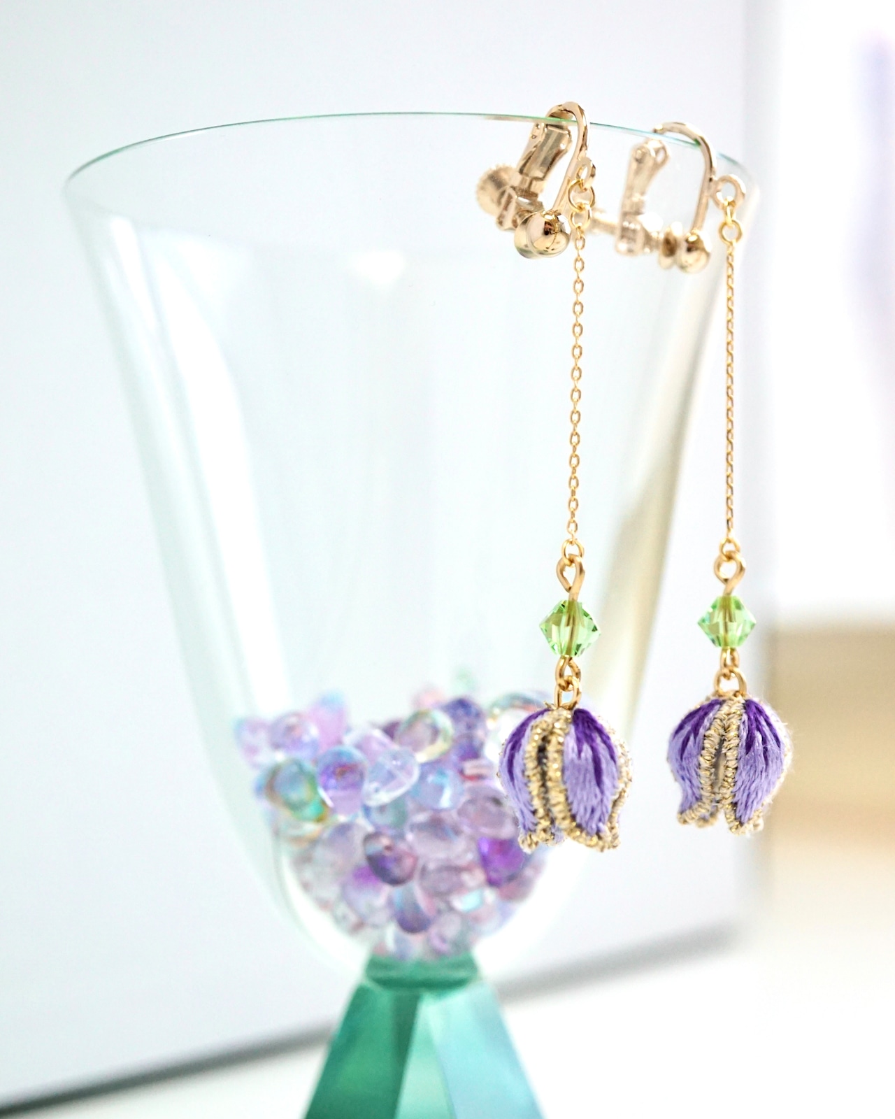 輪郭にワイヤーを縫いこんで立体的に成形できるスタンプワークという技法を使った、ひと粒すずらんの立体刺繍ピアス/イアリングです。
