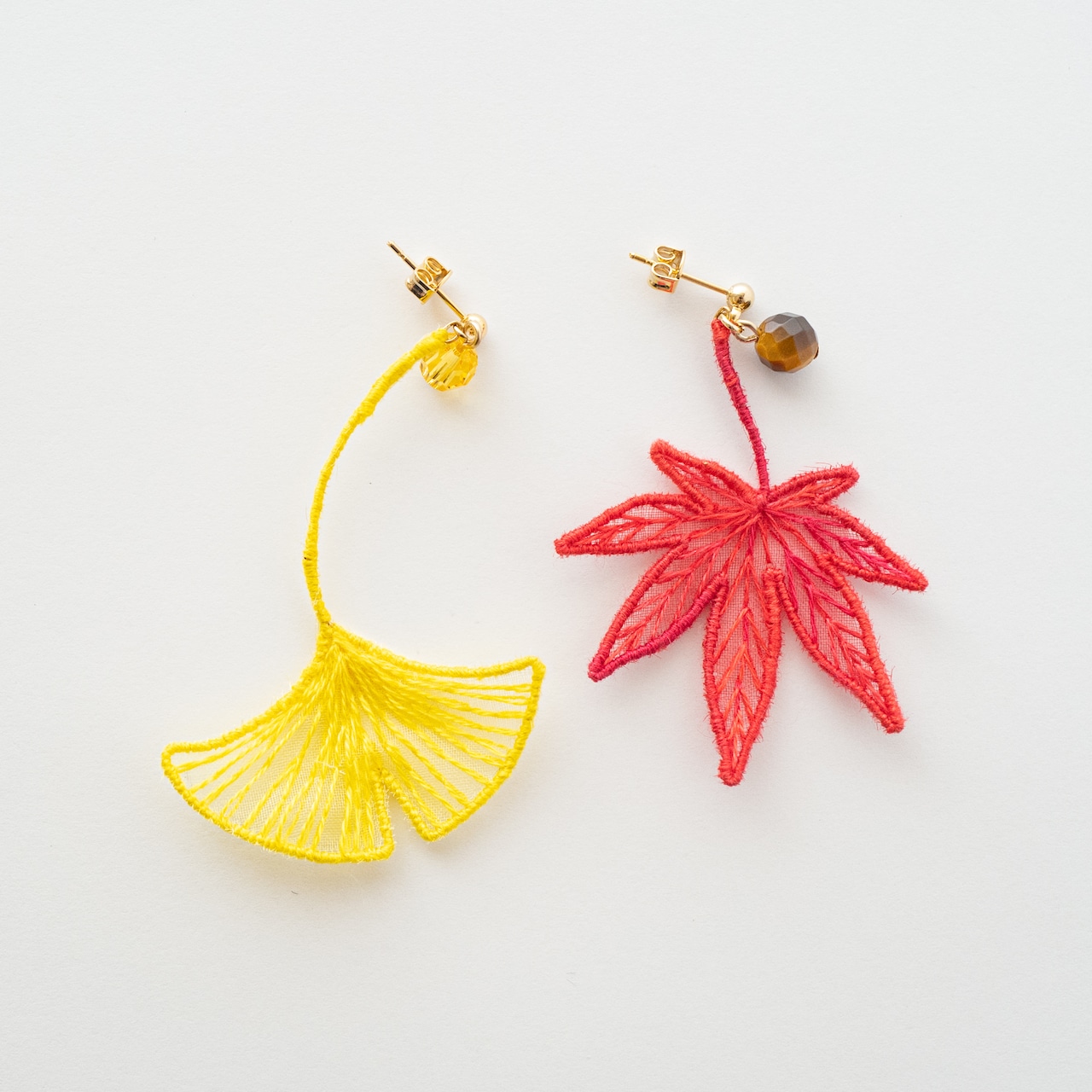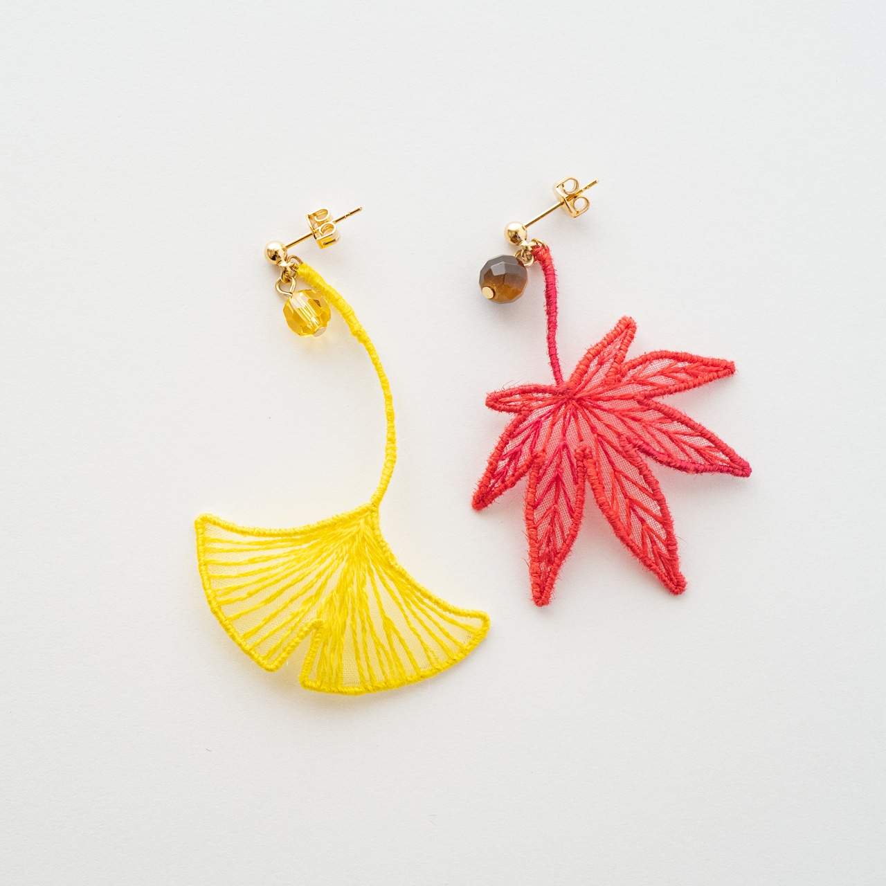 輪郭にワイヤーを縫いこんで立体的に成形できるスタンプワークという技法を使った、秋の葉っぱモチーフの立体刺繍。
