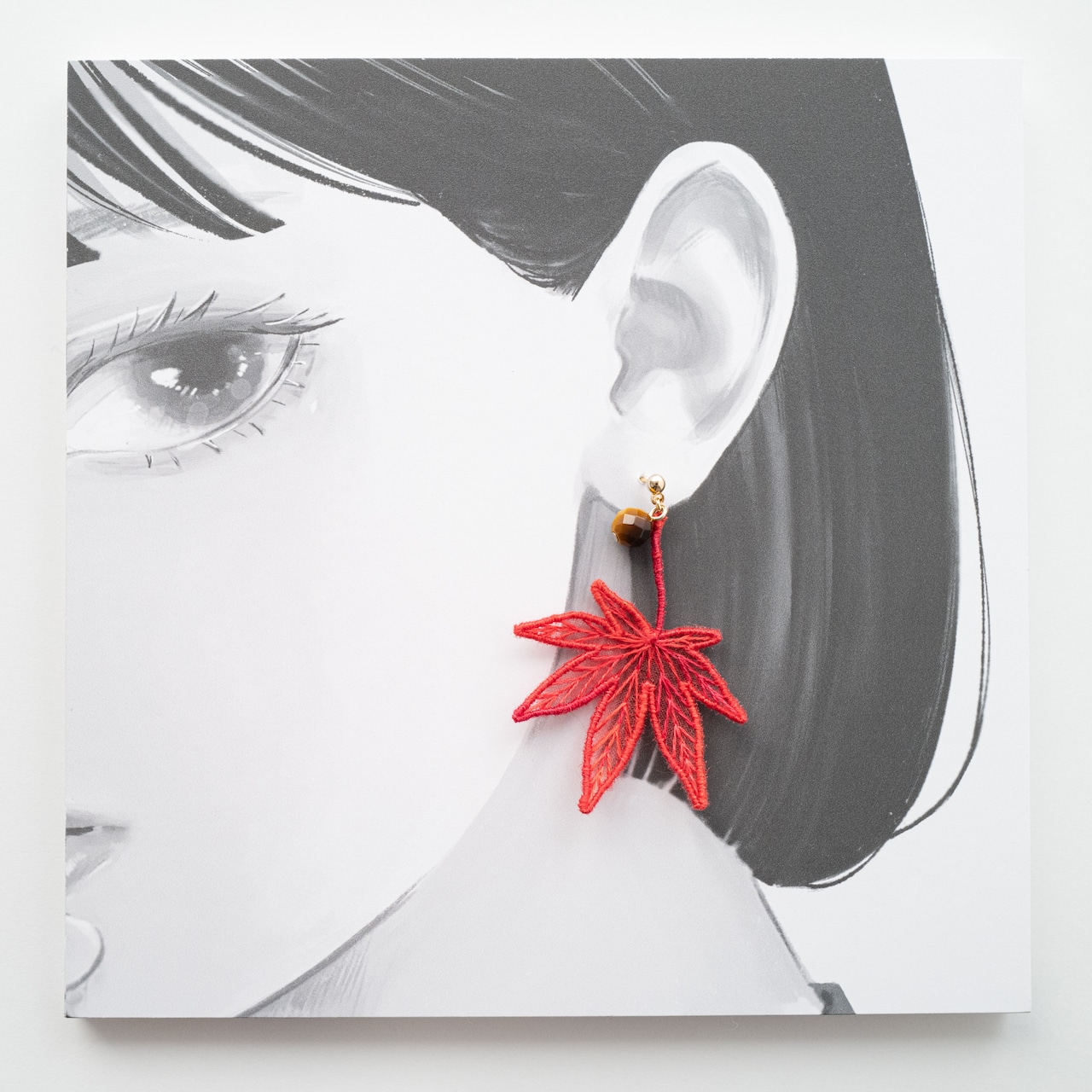 糸を使用したアクセサリーです。ご使用状況や経年で糸の毛羽立ちが出る場合や、ほつれてくる場合があります。ワイヤーを使用した作品は加圧で変形します。水濡れ、摩擦、衝撃などで破損する恐れがあります。長くお使いいただくために、強く引っ張ったり、尖ったものに引っ掛けないようご注意ください。手作りのため、小さなほつれ、ヨレなどは風合いとしてご理解いただけますと幸いです。