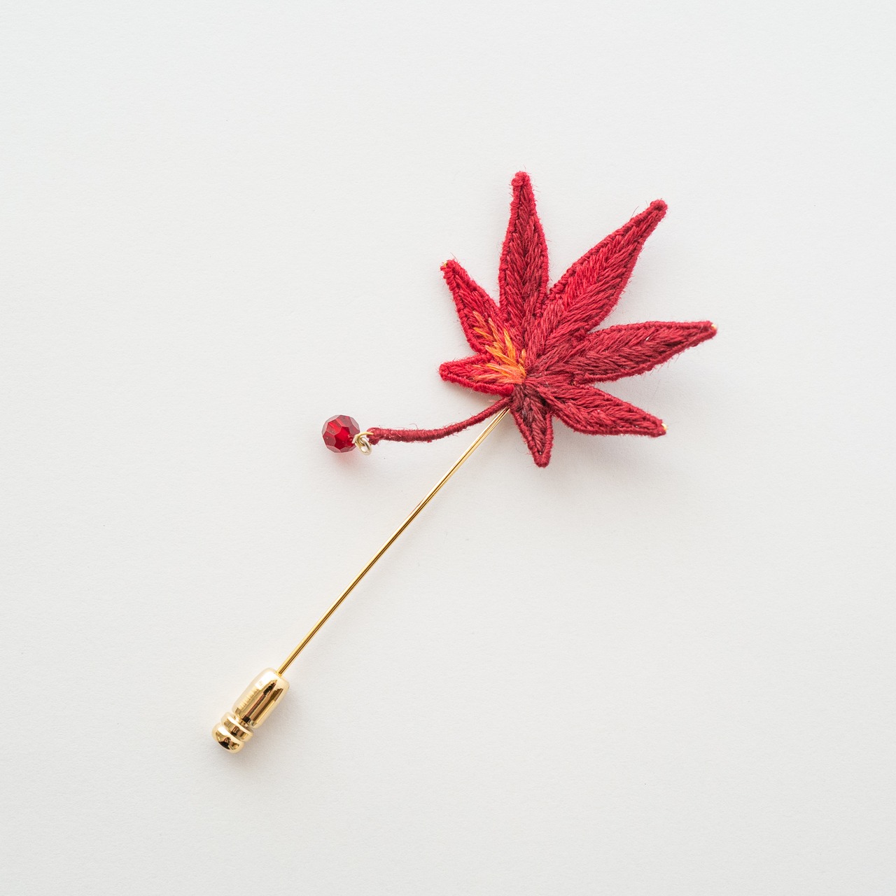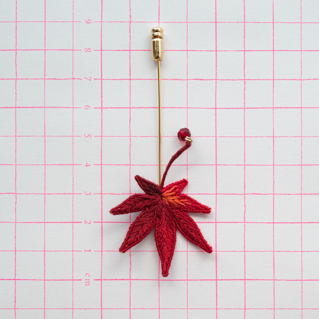 輪郭にワイヤーを縫いこんで立体的に成形できるスタンプワークという技法を使った、秋の葉っぱモチーフの立体刺繍ハットピンです。