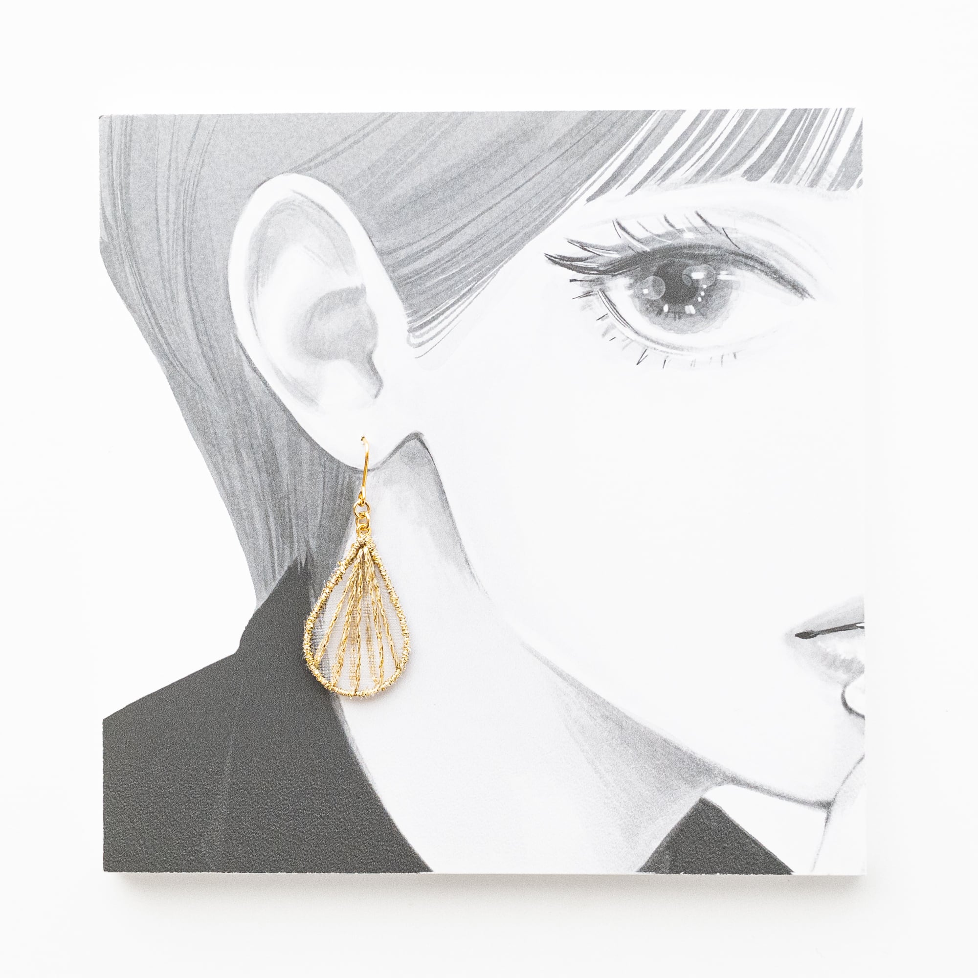 メタルフレームを使用した、オーガンジー刺繍のピアス(イアリング)の刺繍キットです。