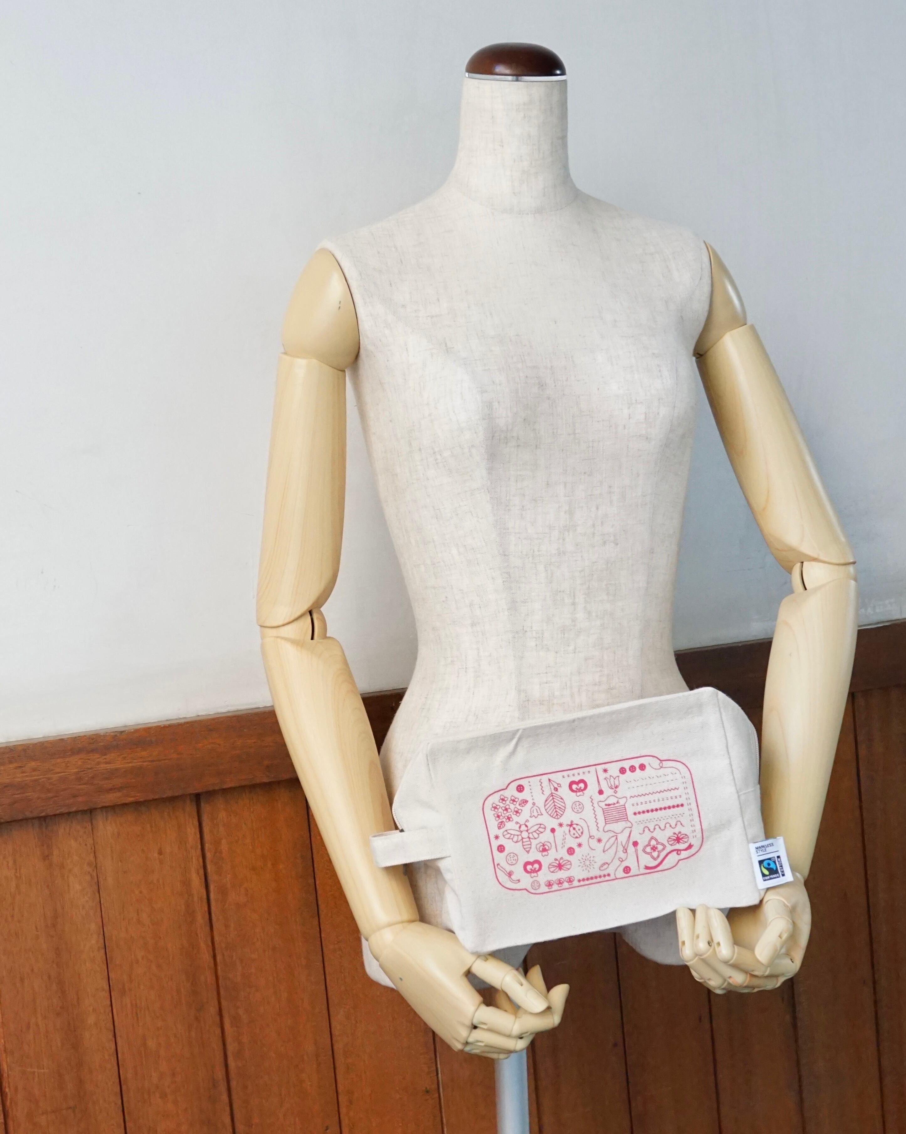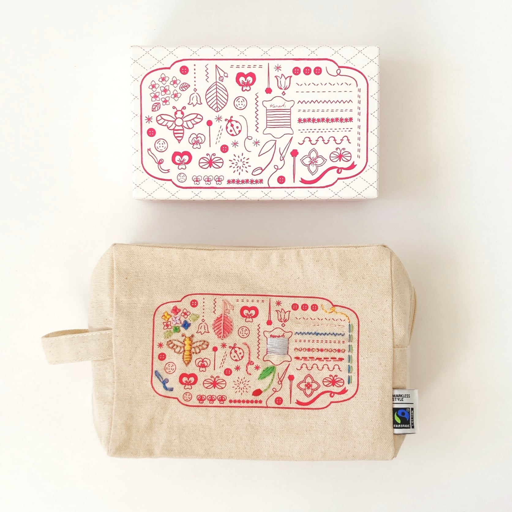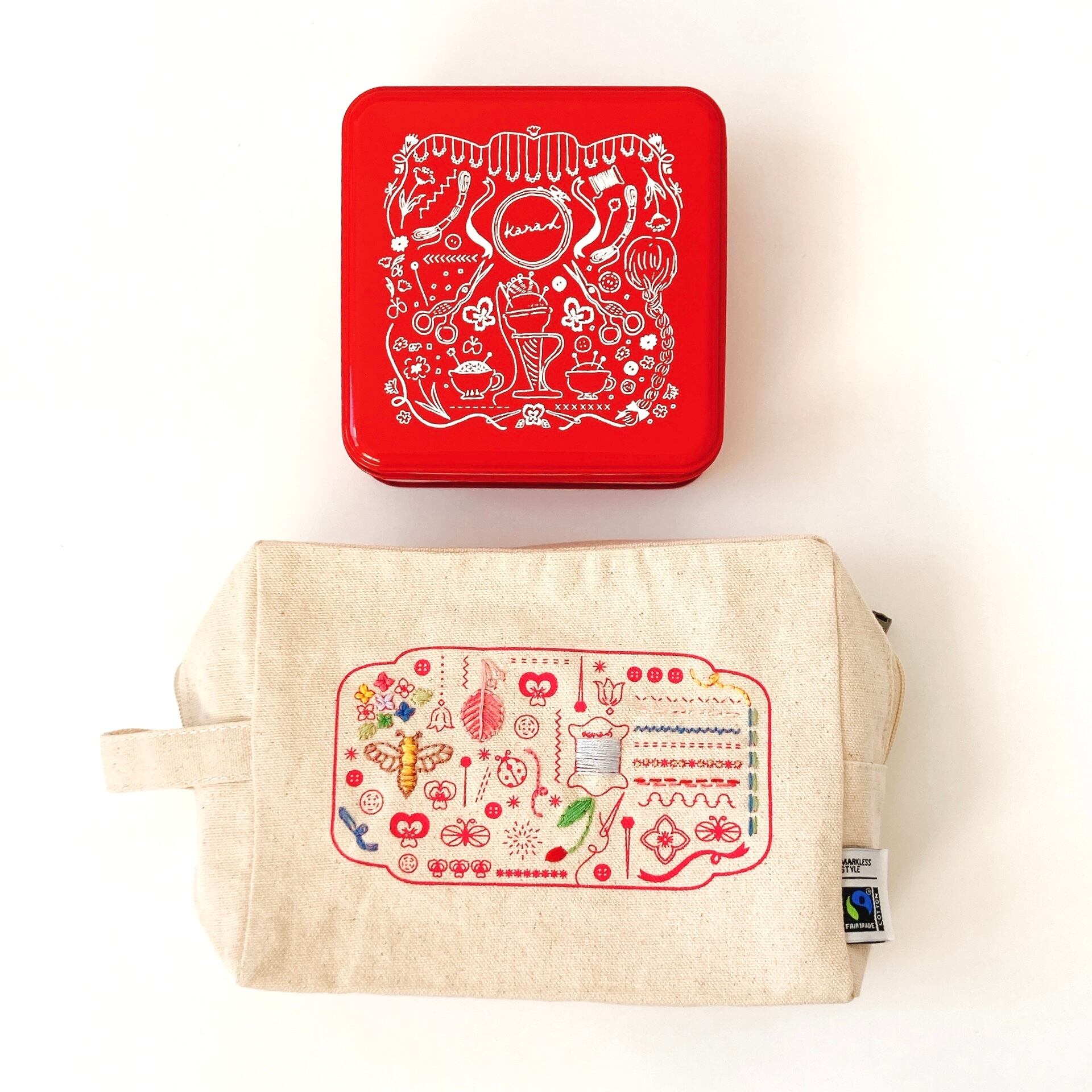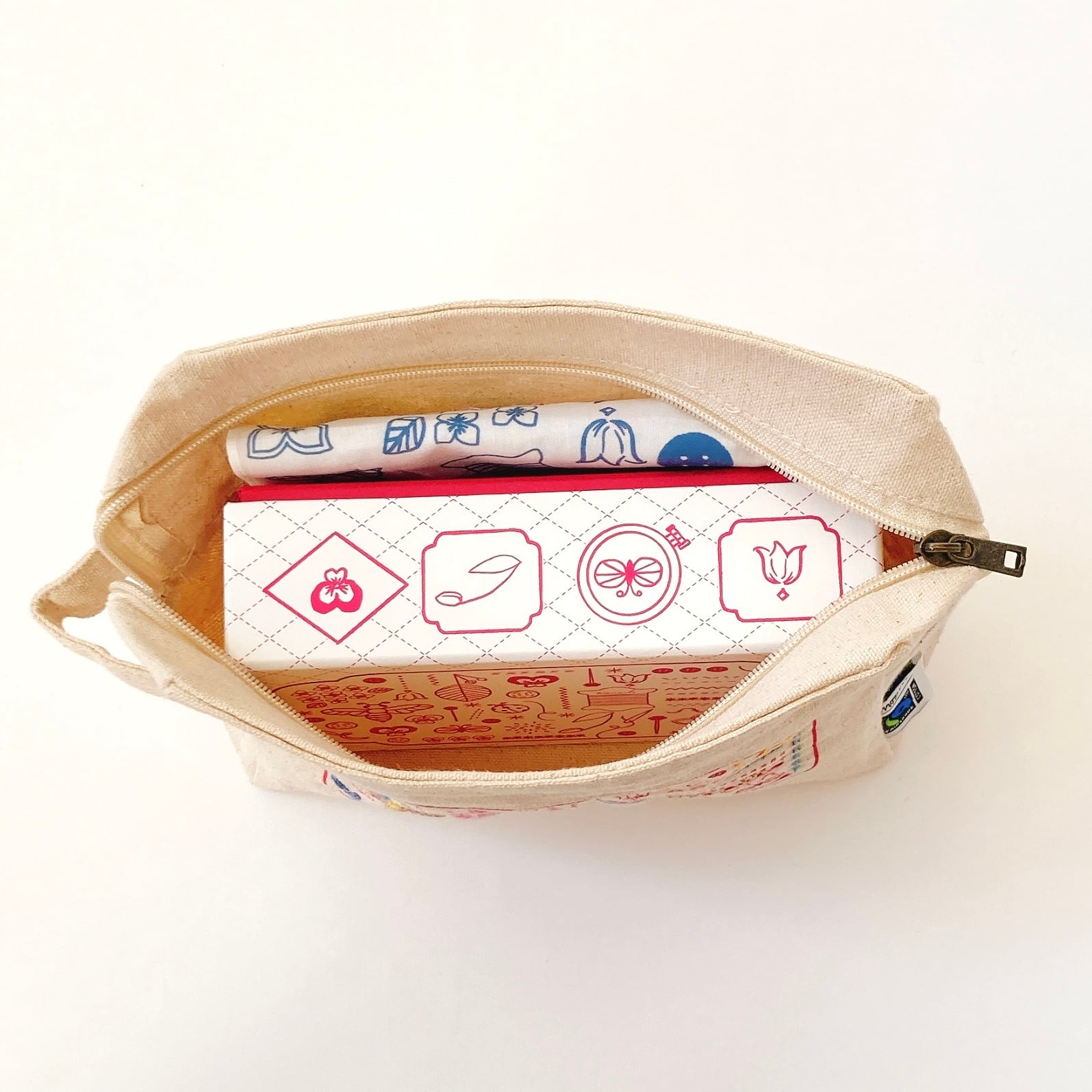 作品やステッチなどオリジナルのモチーフをたくさん詰め込め込んだオリジナルデザインのポーチ。