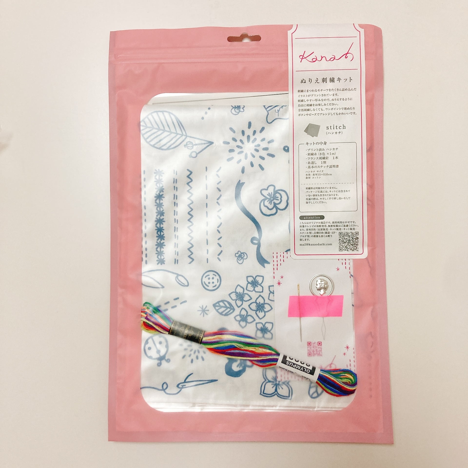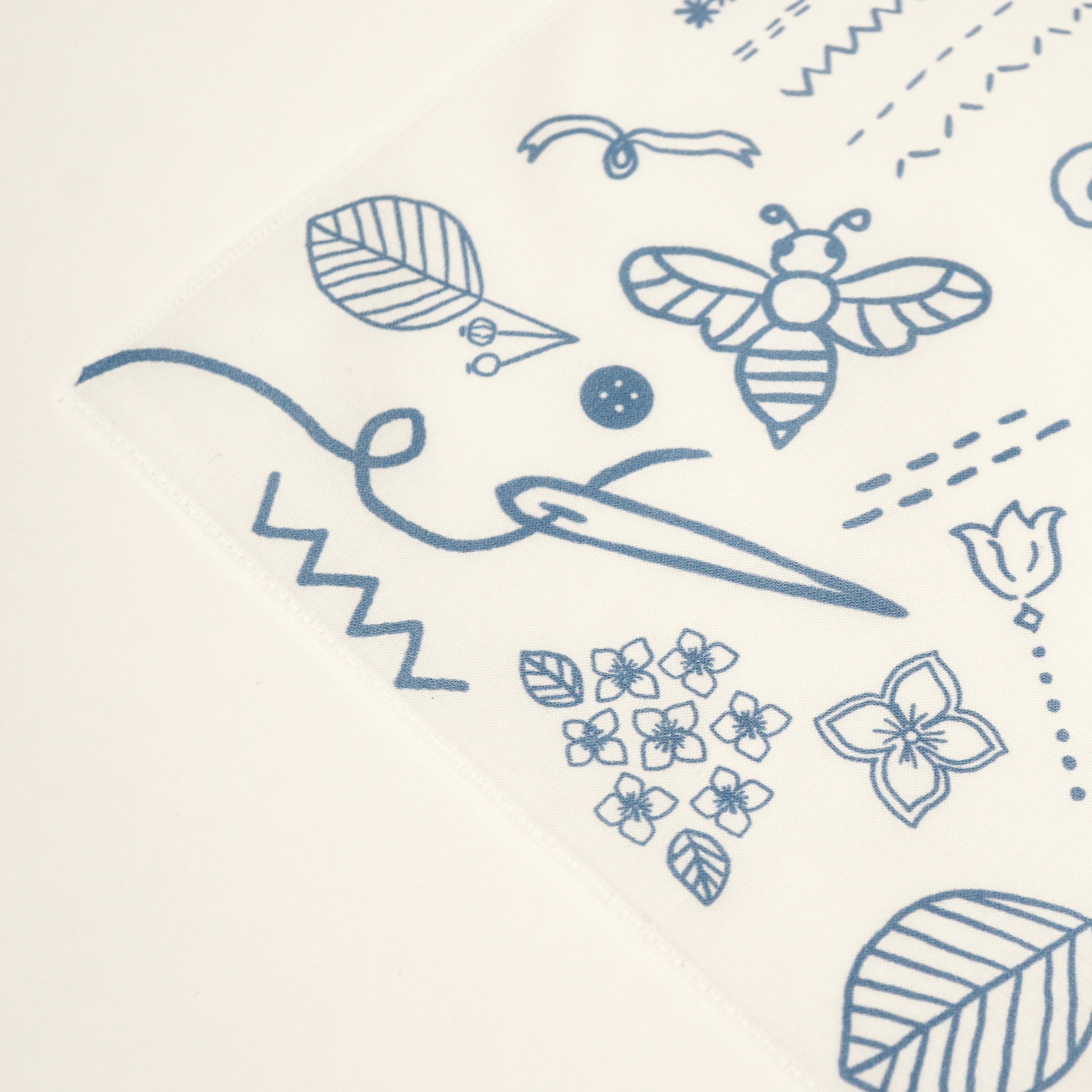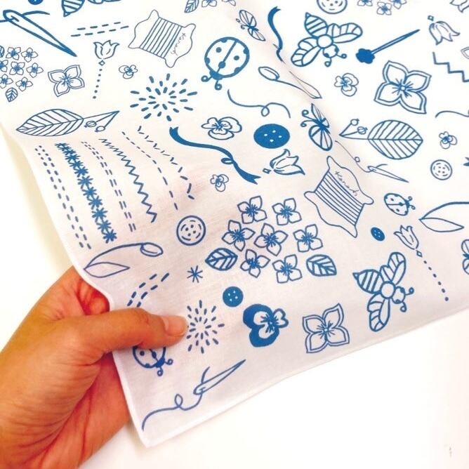 作品やステッチなどオリジナルのモチーフをたくさん詰め込め込んだオリジナルデザインのハンカチ。