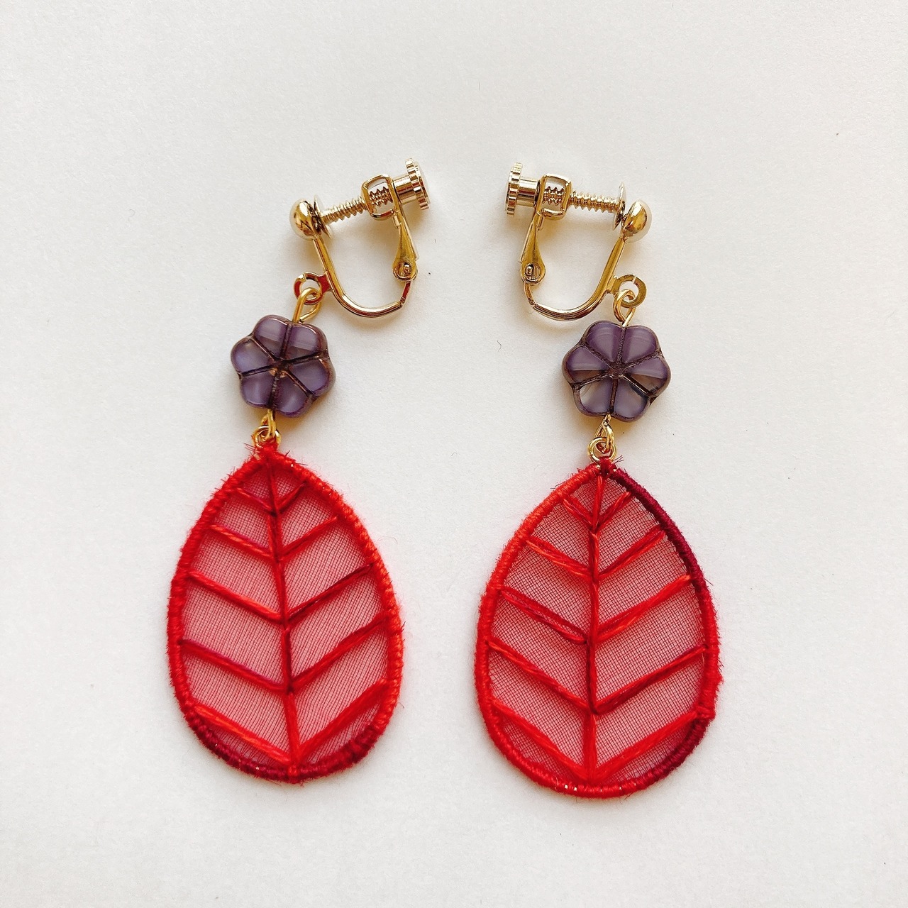 輪郭にメタルパーツを縫いこんだオーガンジーの刺繍イアリング/ピアスです。